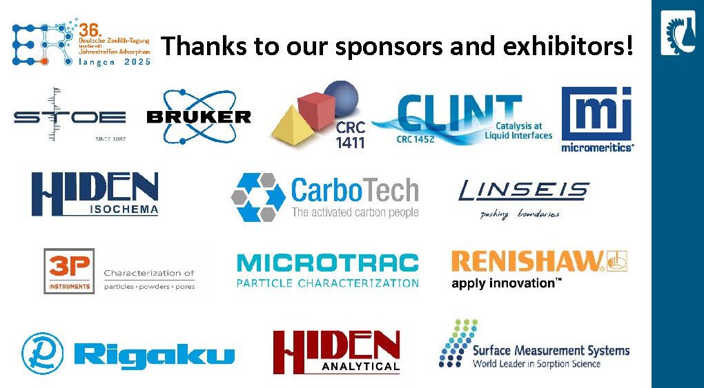 Dank geht auch an unsere Sponsoren und Aussteller. Wir danken besonders unserem Platinum Sponsor CarboTech, unseren Gold Sponsoren Anton Paar und Linde, unserem Silber Sponsor Grace, dem George-Kokotailo Award Sponsor Clariant und dem Poster Award Sponsor CWK.