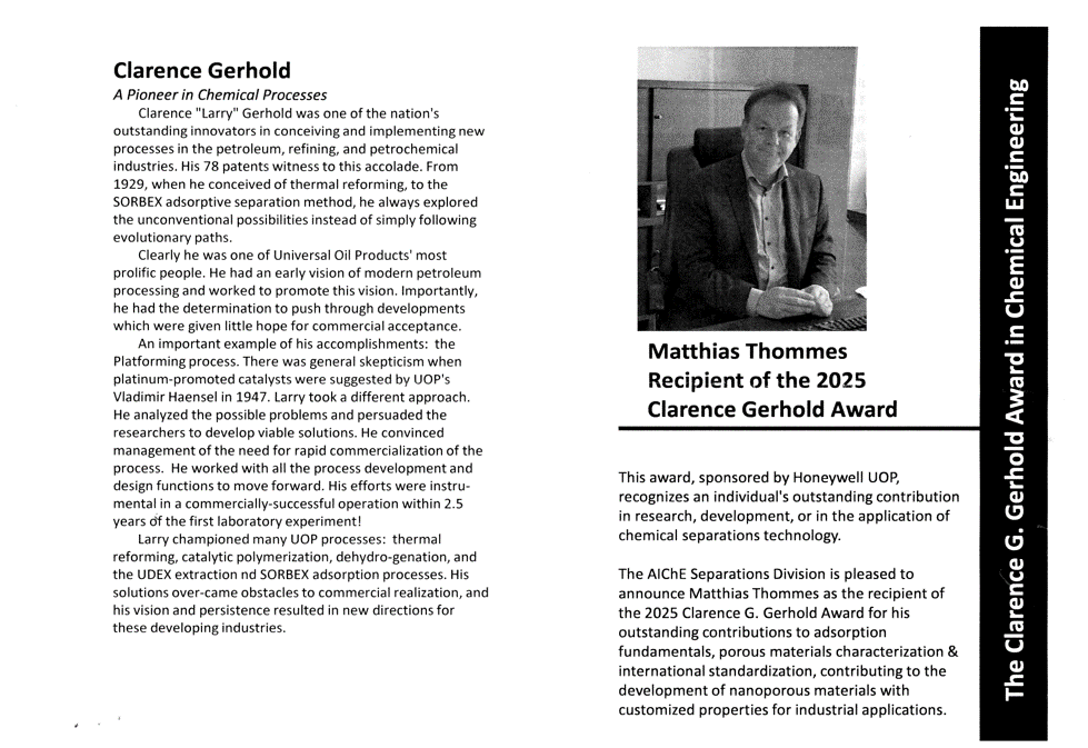 Prof. Matthias Thommes, ein weltweit anerkannter Wissenschaftler auf dem Gebiet der Adsorption und porösen Materialien, wurde aufgrund seiner jahrzehntelangen Forschungsarbeit für diese hohe Auszeichnung ausgewählt. Er ist in seinem Fachgebiet hochdekoriert: 2021 wurde er bereits zum Fellow der International Adsorption Society (IAS) ernannt und 2024 mit einer Ihm gewidmeten wissenschaftlichen Session und der Ehrenplakette der AIChE Separations Division ausgezeichnet.